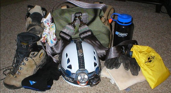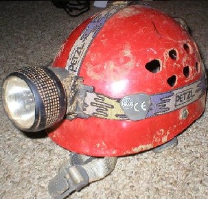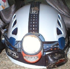 I currently use a white Petzl Elios helmet with a Petzl Myo (5 LED/halogen combo) light as my main light and a Petzl Tactikka (3 LED) light as my backup. I also carry a Mag stick light in my pack. When I first began I used a red Petzl Ecrin Roc heltmet and a single halogen Petzl Zoom. That sets still works well as a back up (or you can use it if you want me to take you caving sometime). I have found that the Elios is much lighter, easier to size down and fits much more slim than the Ecrin Roc. |